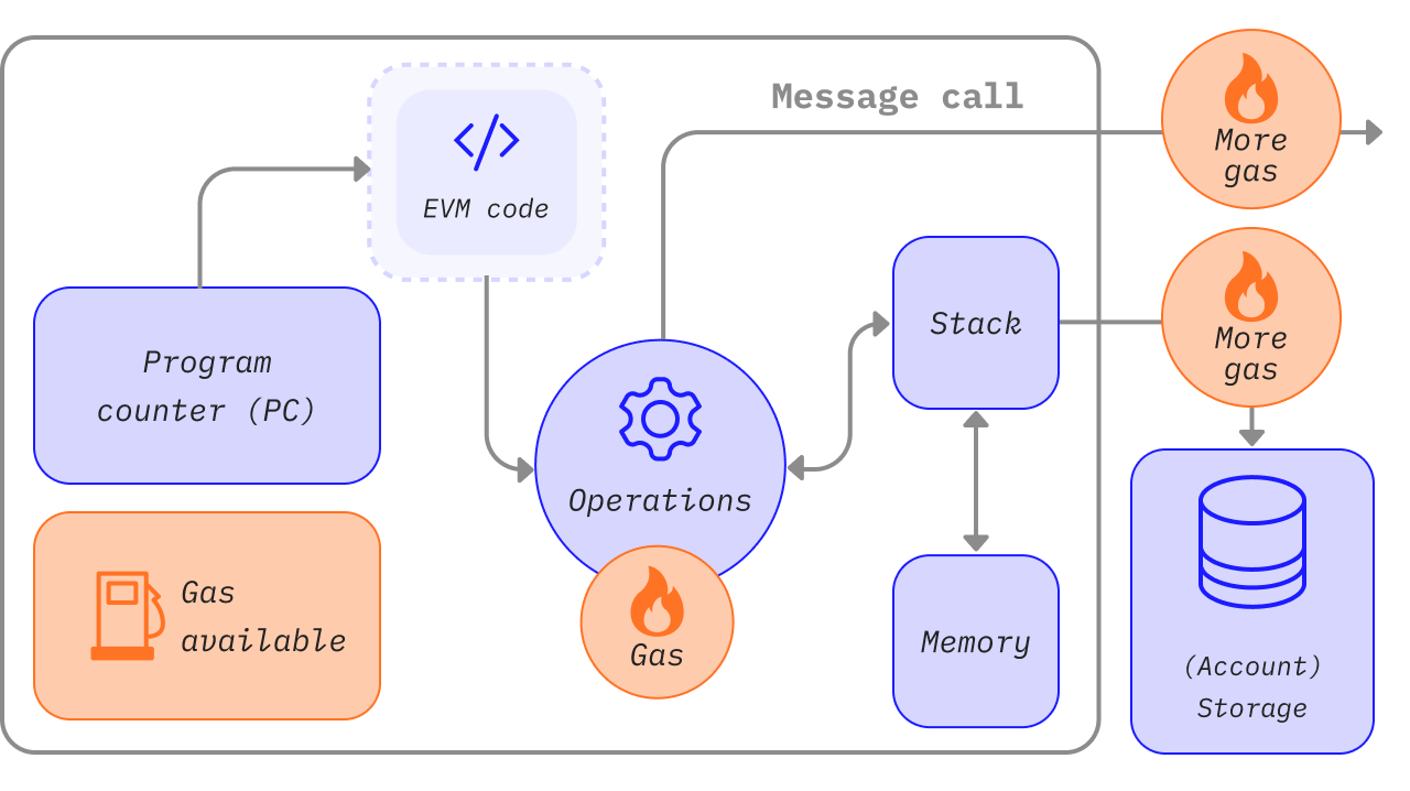 A diagram showing where gas is needed in EVM operations Diagram adapted from Ethereum EVM illustratedopens in a new tab