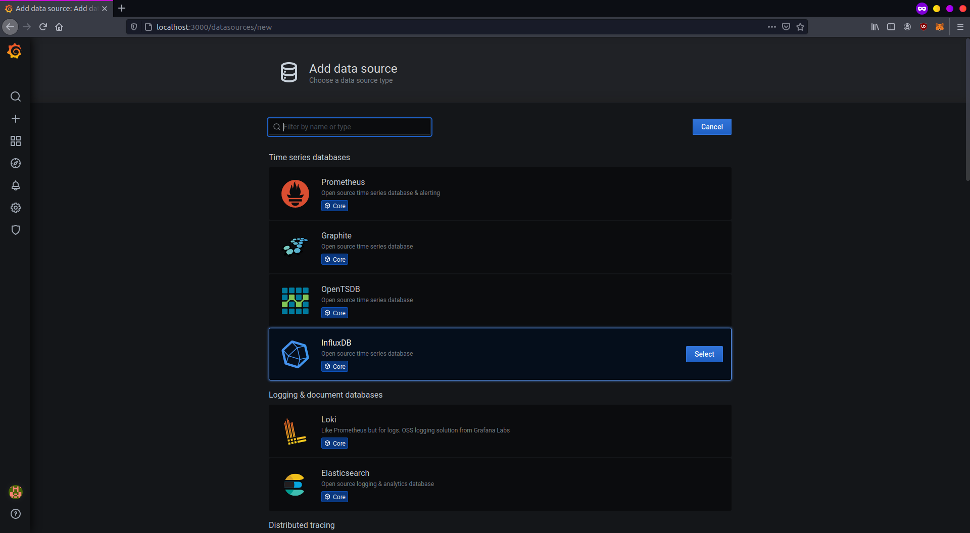After successfully installing InfluxDB, make sure it's running on background. By default, it is reachable at localhost:8086