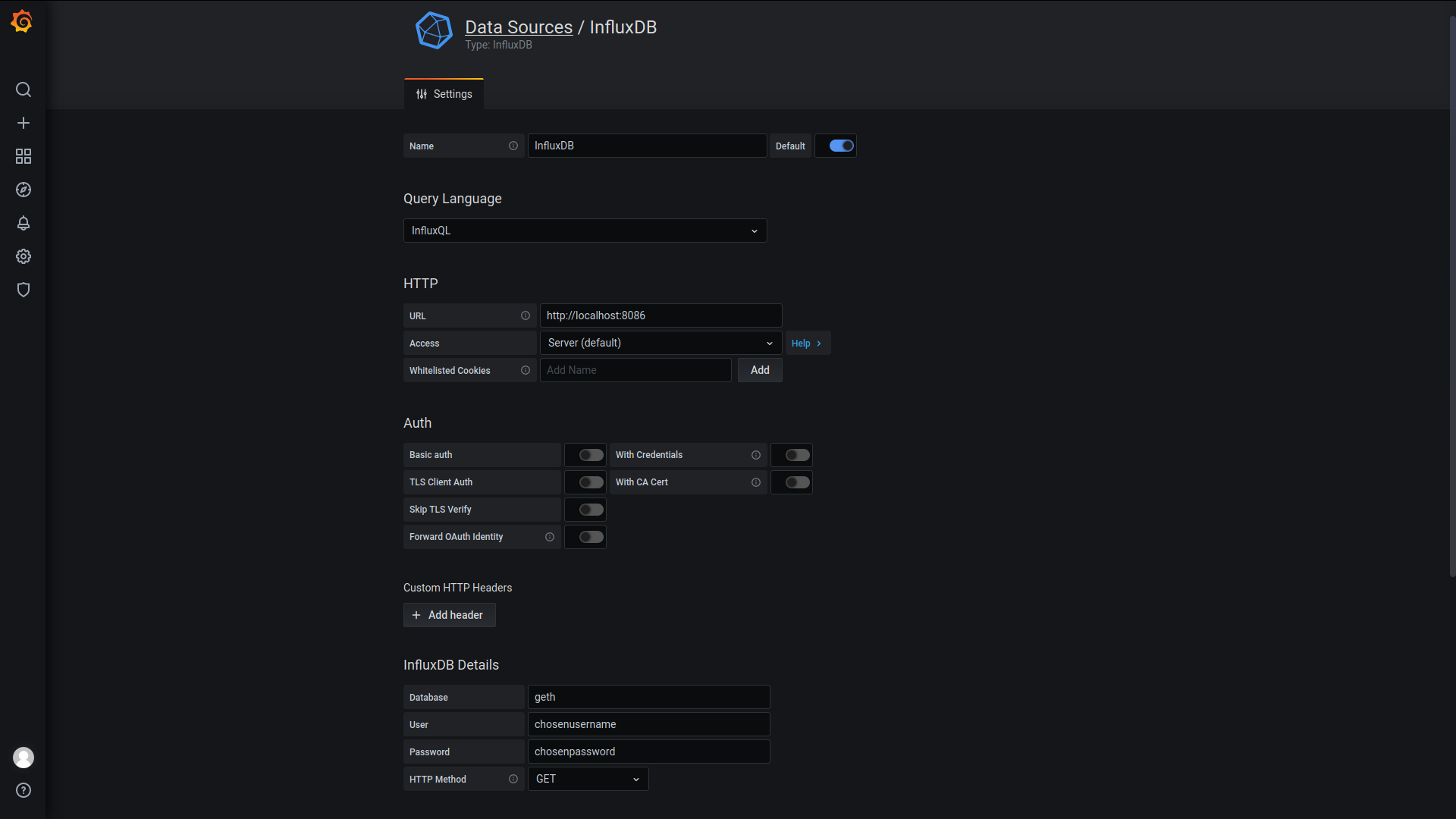 . Multiple options can be found there, in this case we want Geth to push data into InfluxDB.