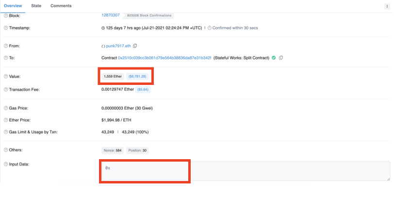 If we look in that transaction and click Click to see More, we see that the call data, called input data, is indeed empty (0x). Notice also that the value is 1.559 ETH, that will be relevant later.