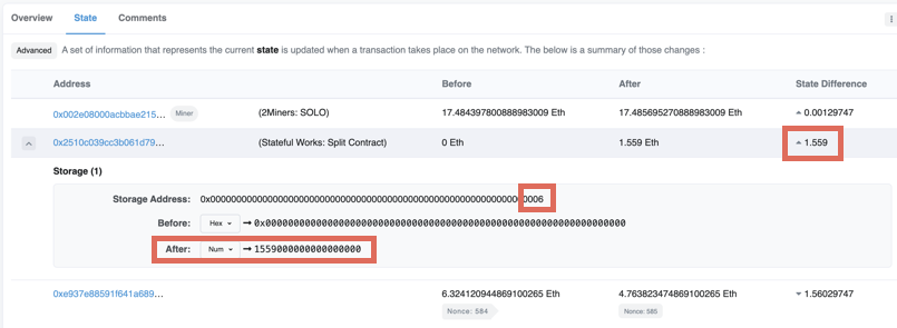 Next, click the State tab and expand the contract we're reverse engineering (0x2510...). You can see that Storage[6] did change during the transaction, and if you change Hex to Number, you see it became 1,559,000,000,000,000,000, the value transferred in wei (I added the commas for clarity), corresponding to the next contract value.